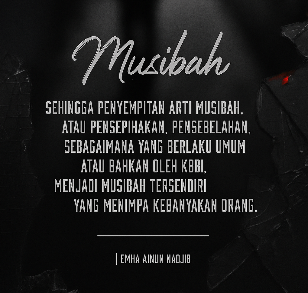 Mbah Nun menegaskan bahwa musibah berarti “sesuatu yang menimpa.” Tidak ada ketentuan apakah itu buruk atau baik, menyenangkan atau menyusahkan, menyakitkan atau menggembirakan. Apa saja yang menimpa kehidupan manusia disebut musibah.