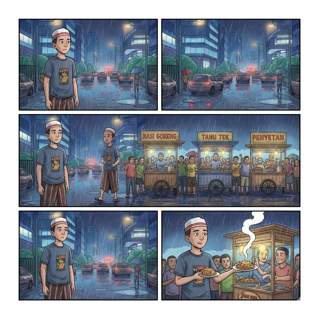 Sambil menikmati macet karena banjir, saya melihat gerobak nasi goreng, tahu tek, dan penyetan ramai dikerubung orang. Mungkin orangnya sama seperti saya yang merasakan lapar. Saya keliling untuk mencari makan dan mampir mungkin ke empat gerobak, selalu mengatakan habis. Dan di gerobak kelima, saya akhirnya beruntung mendapatkan satu porsi terakhir nasi goreng.