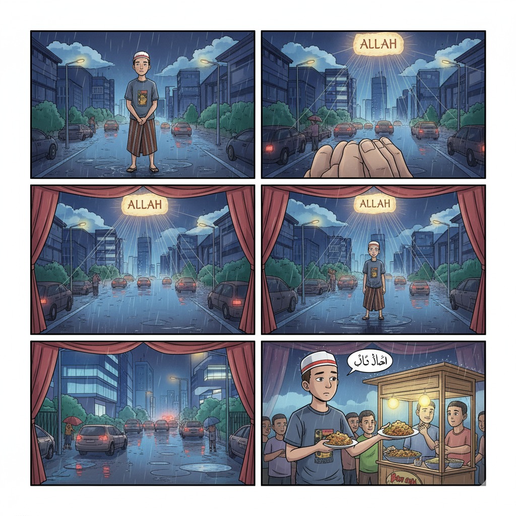 Ketika menjelaskan soal ramainya pembeli yang datang ke gerobak-gerobak makanan, itu kita bisa maknai bahwa mengingat semua milik Tuhan itu juga bisa dilakukan ketika pedagang itu ramai pembeli. Pedagang senang dagangan laris, uangnya banyak, dan bisa pulang cepat—itu harus disyukuri, dan pemicu syukur itu adalah memaknai bahwa rezeki yang ia dapat adalah dari Allah dan nanti akan kembali kepada-Nya. Dalam arti, si pedagang harus meyakini bahwa ada kalanya gerobaknya sepi pembeli. Karena pada saat sepi itulah proses rezekinya si pedagang kembali kepada-Nya.