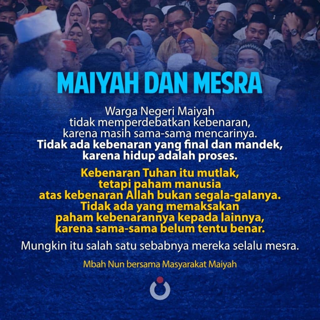 Mari kita rumuskan bersama! Apa saja puing-puing yang telah hancur dari Kapal Nuh itu? Bagaimana cara merangkainya kembali agar menjadi kapal yang kuat? Dan sejauh mana jamaah Maiyah mampu mempersatukan puing-puing tersebut?