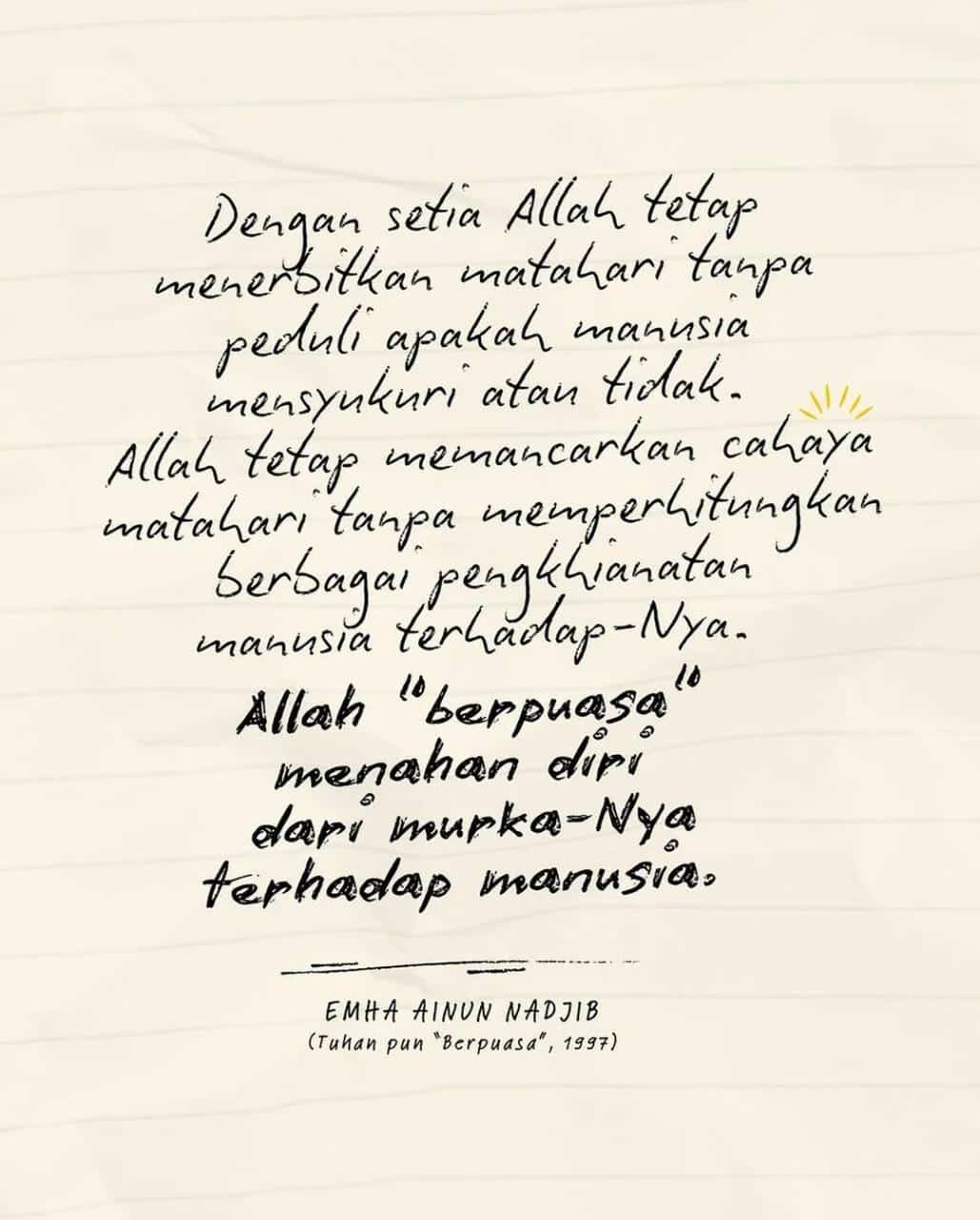 Bulan Maret tahun ini terasa istimewa karena beriringan dengan Ramadan, bulan di mana umat Islam menjalankan ibadah puasa sebulan penuh, menahan lapar dan dahaga sebagai latihan spiritual. Menurut Mbah Nun, puasa mengajarkan kita bahwa hidup tidak hanya tentang hak, tetapi juga tentang kewajiban, larangan, dan anjuran. Puasa melatih diri untuk mengendalikan hawa nafsu, menumbuhkan kesadaran bahwa manusia sejati adalah yang mampu menahan diri demi mencapai ketakwaan.